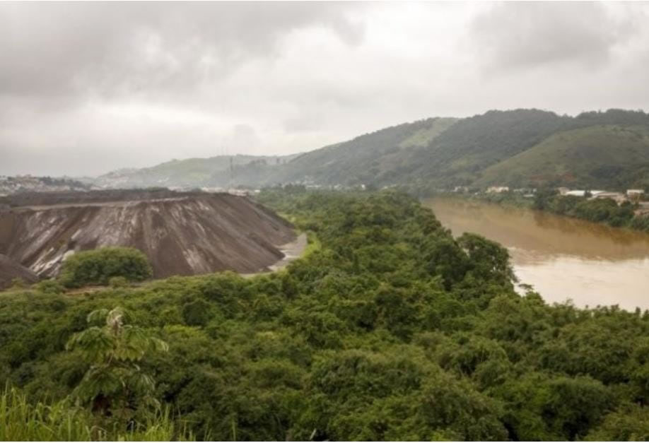 (Foto da formação de uma montanha de pilha de escória com leito do rio a Jusante)